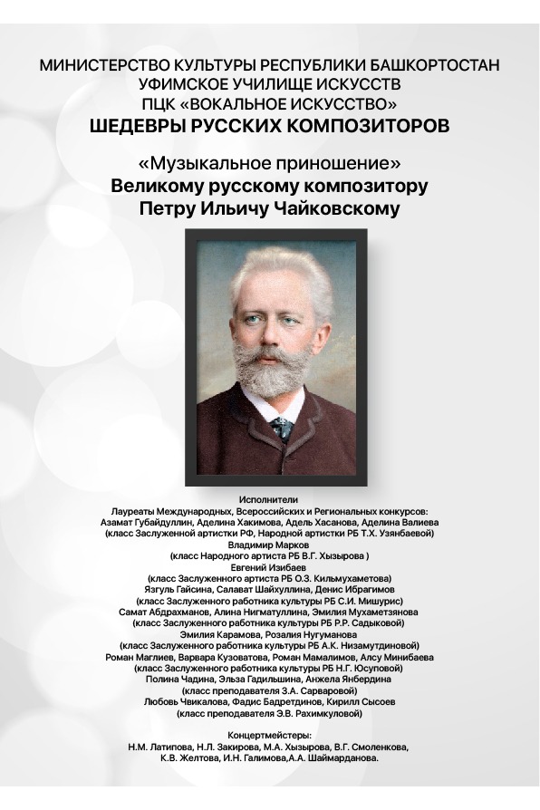 7 мая – день рождения великого музыкального гения – Петра Ильича Чайковского. Представляем вашему вниманию концерт-приношение, посвящённый 180-летию со дня рождения П.И. Чайковского. В концерте в исполнении студентов Уфимского училища искусств звучат шедевры вокальной музыки русских композиторов.