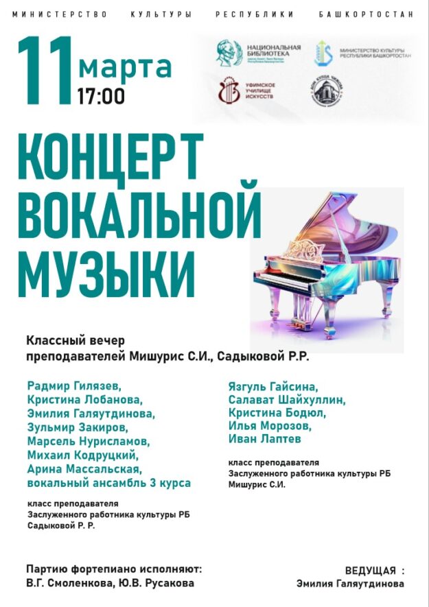 11 марта 2025 года в Доме купца Чижова (Национальная библиотека РБ) состоится концерт вокальной музыки. Выступят студенты вокального отдела Уфимского училища искусств, обучающиеся под руководством заслуженного работника культуры РБ Р.Р. Садыковой и заслуженного работника культуры РБ С.И. Мишурис. Партия фортепиано — Виктория Смоленкова и Юлия Русакова. Начало — в 17.00 часов. Адрес: г. Уфа, ул.…