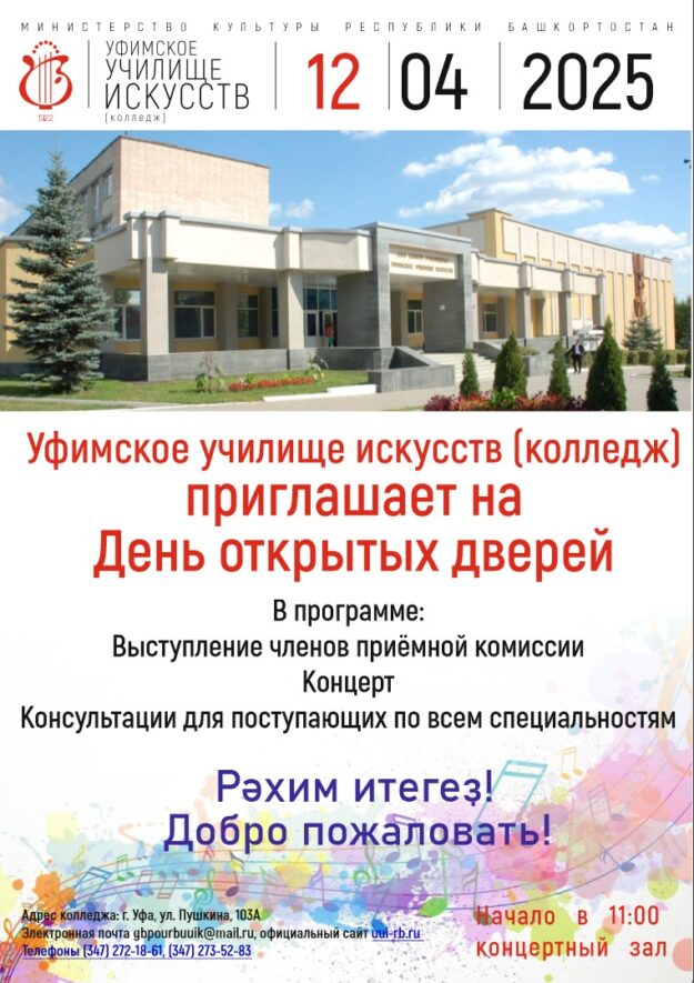 Дорогие друзья! 12 апреля 2025 года Уфимское училище искусств приглашает вас на День открытых дверей! В программе мероприятия – знакомство с основными направлениями жизни и работы колледжа, выступление администрации и ответственного секретаря приемной комиссии, концерт, консультации для абитуриентов по всем специальностям. В этот день вы сможете узнать все о порядке поступления в колледж в 2025…