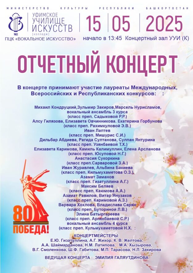 15 мая 2025 года приглашаем в Концертный зал Уфимского училища искусств на отчетный концерт ПЦК «Вокальное искусство». Начало — в 13.45! Добро пожаловать!