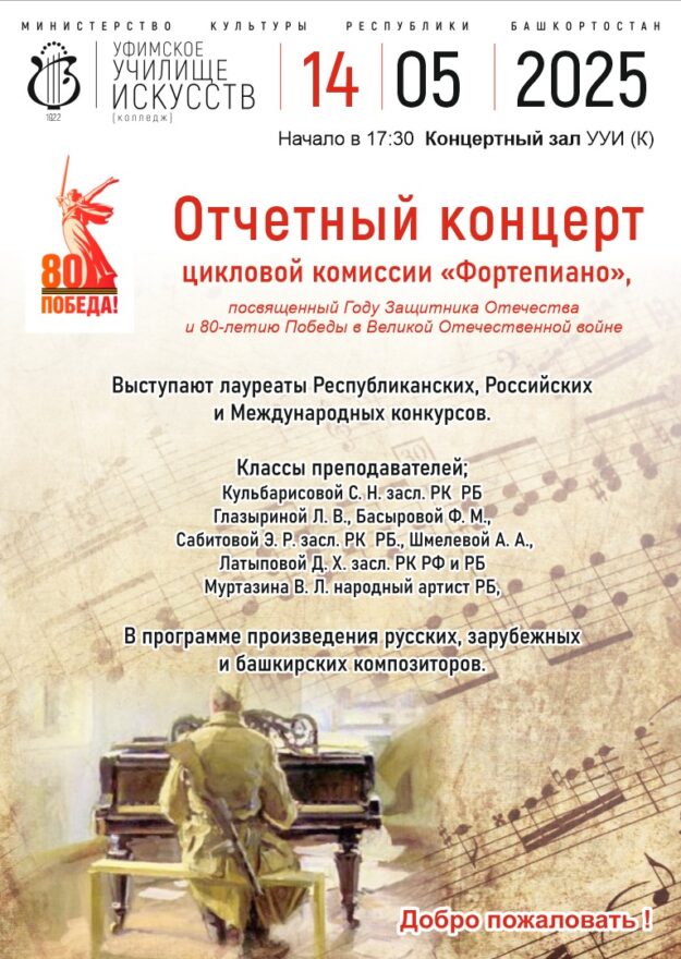 14 мая 2025 года приглашаем в Концертный зал Уфимского училища искусств на отчетный концерт ПЦК «Фортепиано». Начало — в 17.30! Добро пожаловать!