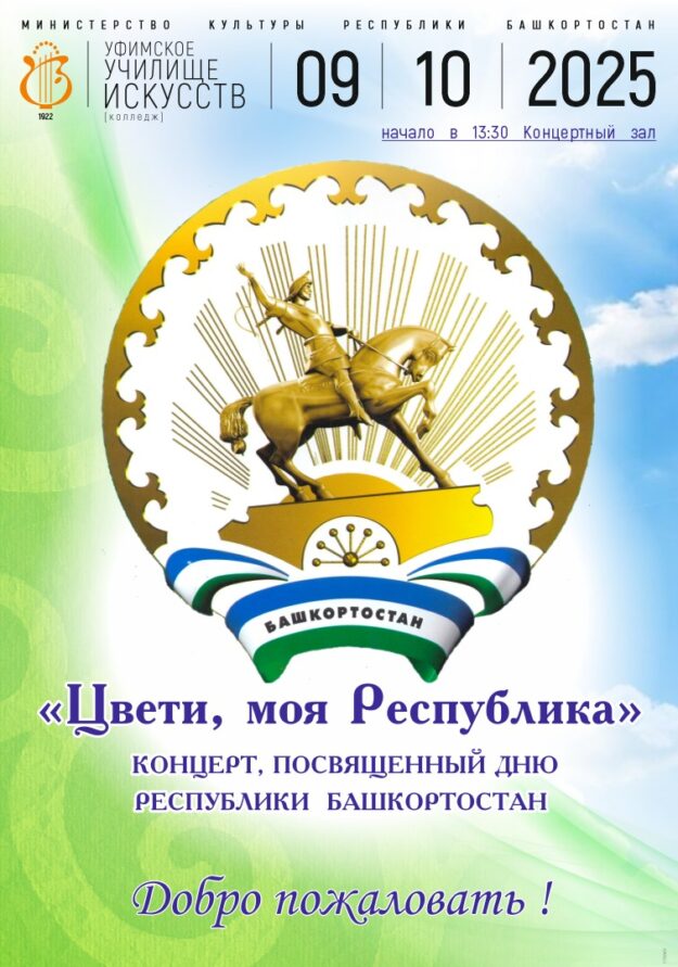 9 октября 2025 года приглашаем в Концертный зал Уфимского училища искусств на концерт «Цвети, моя Республика!», посвящённый Дню Республики Башкортостан. Начало в 13 часов 30 минут. Добро пожаловать!