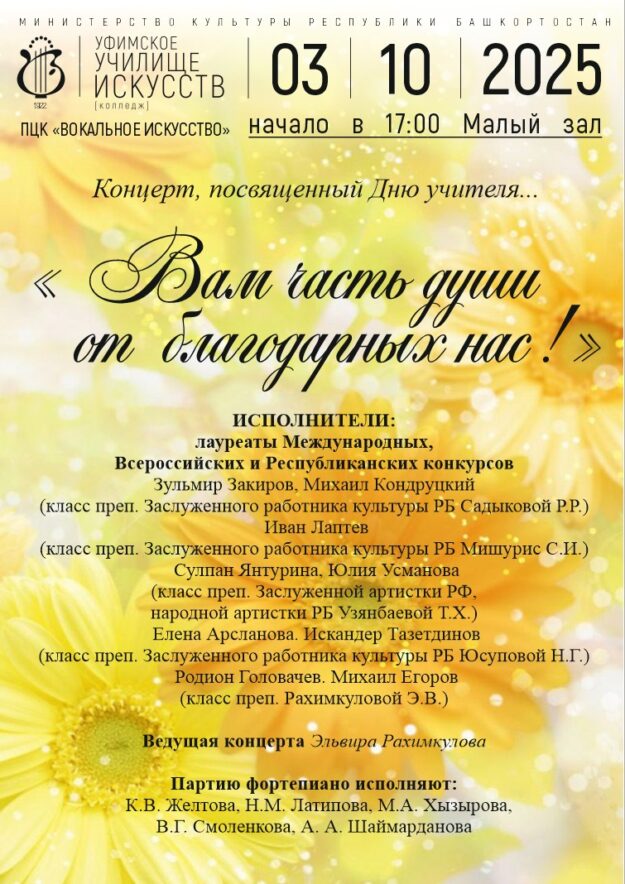 3 октября 2025 года приглашаем в Малый зал Уфимского училища искусств на концерт вокальной музыки «Вам часть души от благодарных нас», посвященный Дню учителя! Начало в 17.00 часов. Добро пожаловать!