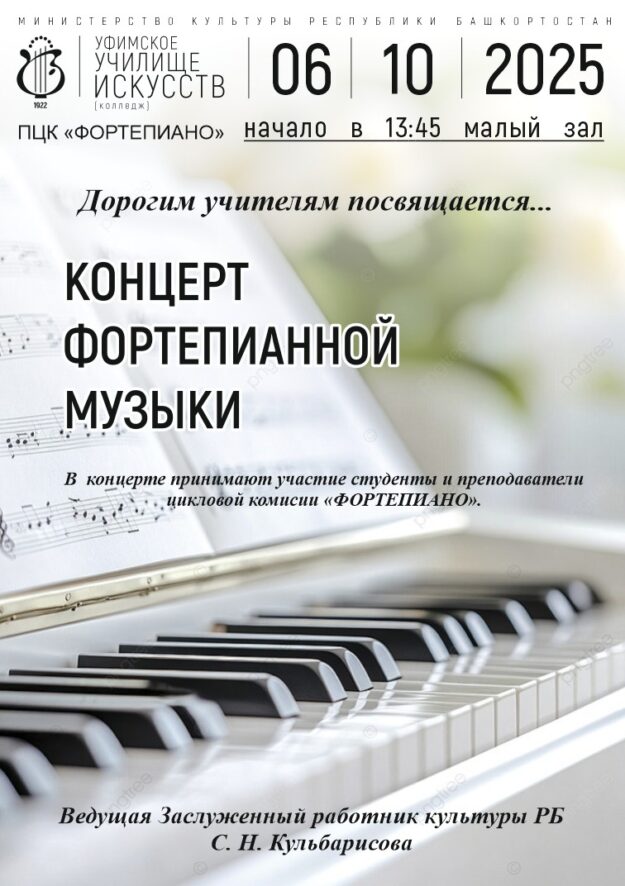 6 октября 2025 года приглашаем в Малый зал Уфимского училища искусств на концерт фортепианной музыки «Дорогим учителям посвящается». В программе выступления студентов и преподавателей предметно-цикловой комиссии «Фортепиано». Начало в 13 часов 45 минут. Добро пожаловать!