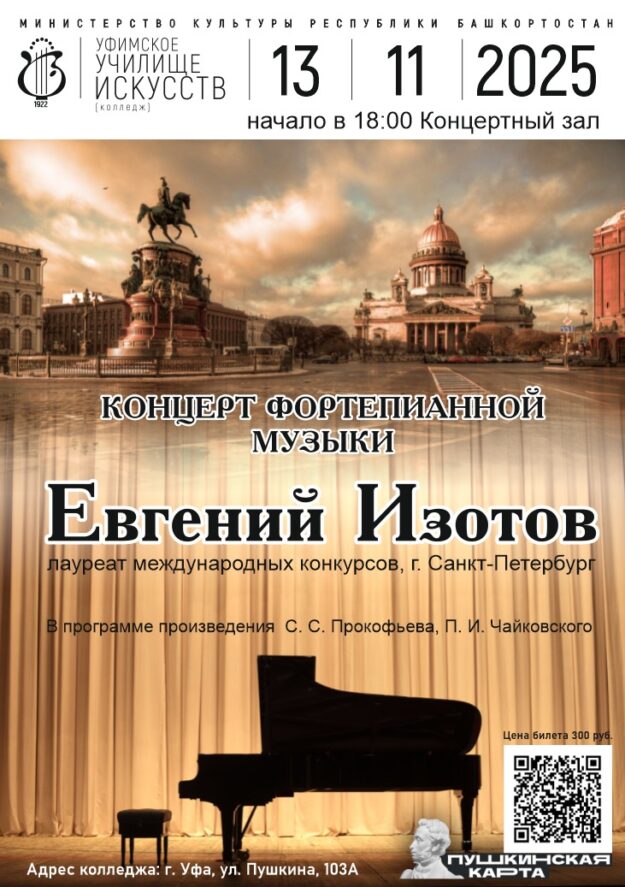 13 ноября в стенах Уфимского училища искусств выступит выдающийся пианист — Евгений Изотов. В программе: произведения С. Прокофьева и П. Чайковского. Начало концерта в 18:00 Кратко о музыканте: Лауреат престижных международных конкурсов. Один из ярчайших современных представителей петербургской фортепианной школы. Его концерты транслировались по телеканалам Mezzo, MBC в Южной Корее, на Radio France, BBC Radio…
