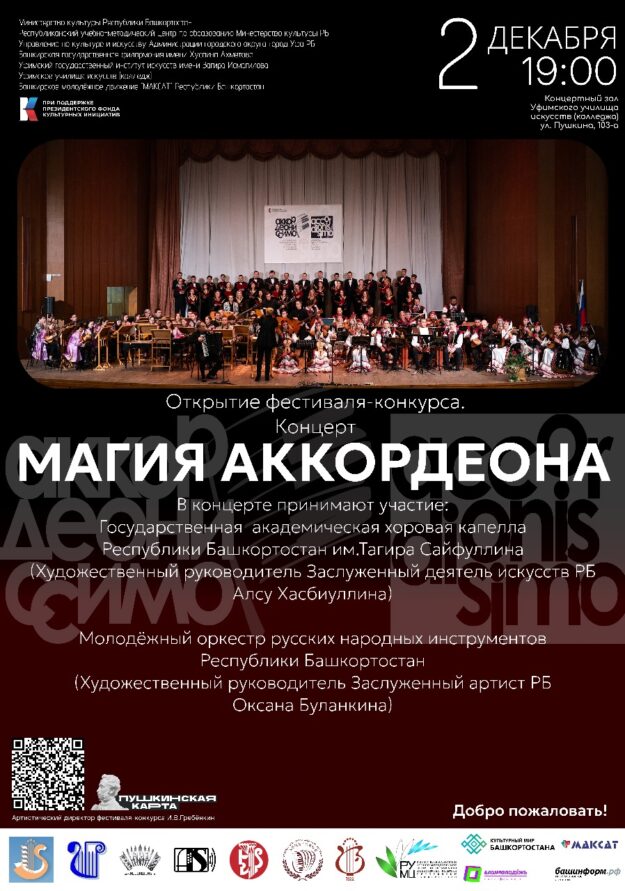 2 декабря 2025 года приглашаем в Концертный зал Уфимского училища искусств на концерт «Магия аккордеона» в рамках X Международного фестиваля-конкурса исполнителей на клавишном аккордеоне «Аккордеониссимо». Начало в 19.00 часов. Билеты можно приобрести на странице https://iframeab-pre7341.intickets.ru/seance/68330045/