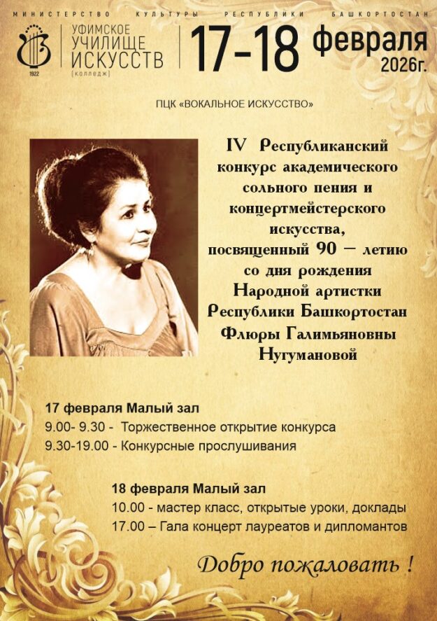 18 и 19 февраля 2026 года приглашаем в Малый зал Уфимского училища искусств на мероприятия IV Республиканского конкурса академического сольного пения и концертмейстерского искусства имени народной артистки Республики Башкортостан Флюры Галимьяновны Нугумановой. Проведение конкурса в 2026 году приурочено к 90-летию со дня рождения певицы. В программе — торжественное открытие конкурса, прослушивания участников, мастер-классы, открытые уроки…