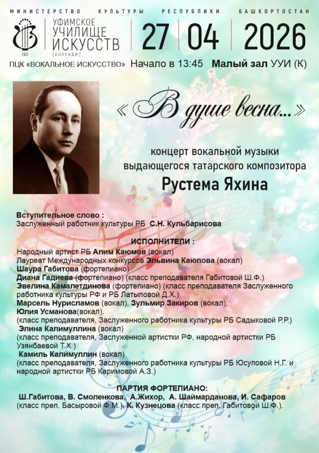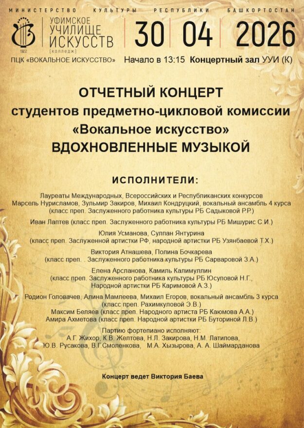 23 апреля 2026 года в Уфимском училище искусств состоялся ежегодный конкурс чтецов среди студентов 1-4 курсов музыкального и художественного отделений, посвященный Дню Победы в Великой Отечественной войне 1941-1945 гг. Мастерство и талант конкурсантов оценивало жюри, в состав которого вошли: заслуженный работник образования Республики Башкортостан, председатель предметно-цикловой комиссии общих гуманитарных и социально-экономических дисциплин, преподаватель башкирского языка…