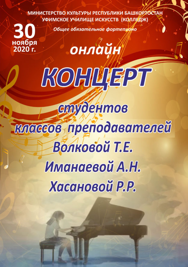 Представляем вашему вниманию онлайн концерт фортепианной музыки. Играют учащиеся Уфимского училища искусств разных специальностей. Выступления подготовлены в рамках изучения дисциплины «общее обязательное фортепиано». Преподаватели – Т.Е. Волкова, А.Н. Иманаева, Р.Р. Хасанова. Приятного просмотра!
