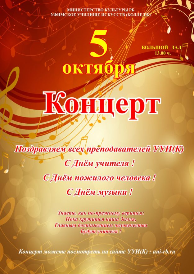 Уважаемые ветераны, преподаватели, сотрудники и студенты! Уфимское училище искусств (колледж) 1 октября традиционно отмечает Международный день музыки и День пожилого человека! Сердечно поздравляем вас с этим днем и особые слова благодарности адресуем нашим преподавателям-ветеранам, которые всю свою жизнь посвятили служению Музыке! Для музыки не существует преград. Музыка является неотъемлемой частью нашей жизни. «Музыка – это разум, воплощенный…