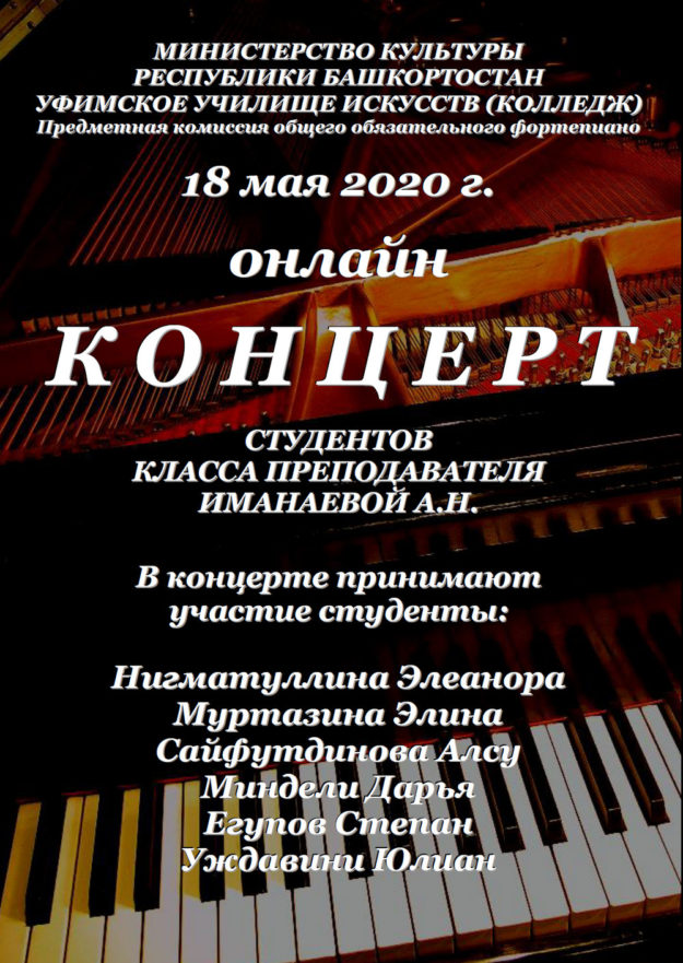 Уфимское училище искусств (колледж) получило несколько партий оборудования, на которое колледжу были выделены деньги в рамках реализации национального проекта «Культура» (Региональный проект «Культурная среда»). Уфимское училище искусств (колледж) был отмечен в перечне профессиональных образовательных организаций Республики Башкортостан, модернизируемых в рамках нацпроекта «Культура». Благодаря руководству Башкортостана, Министерству культуры Республики Башкортостан в 2020 году будет существенно обновлен музыкальный…