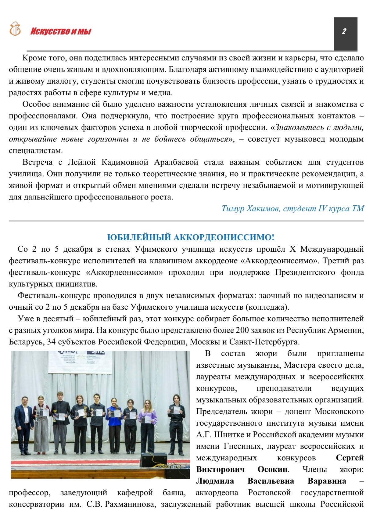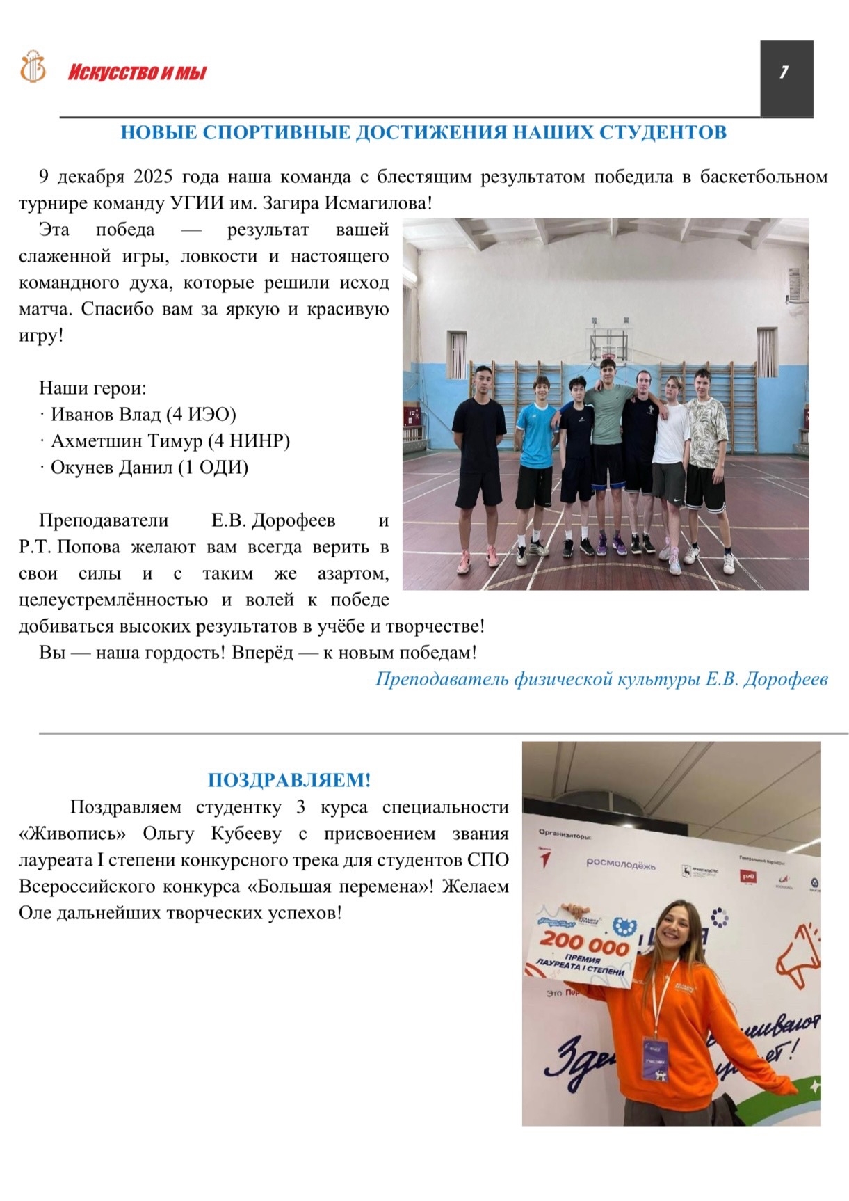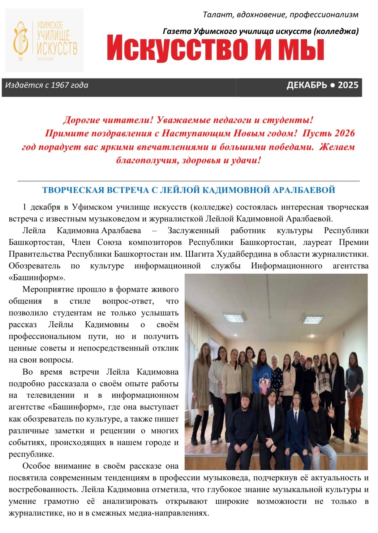 Другие записиПоздравляем с Новым годом!31.12.2025Новогодний календарь25.12.2025День Конституции Республики Башкортостан24.12.2025Приглашаем на Республиканскую выставку — конкурс изобразительного искусства «Многоцветие традиций — V»!23.12.2025Театральные коллективы «Этюд» и «Лики» представят республику на окружном этапе фестиваля «Театральное Приволжье»19.12.2025Торжественное мероприятие 15 декабря 2025 года15.12.2025
