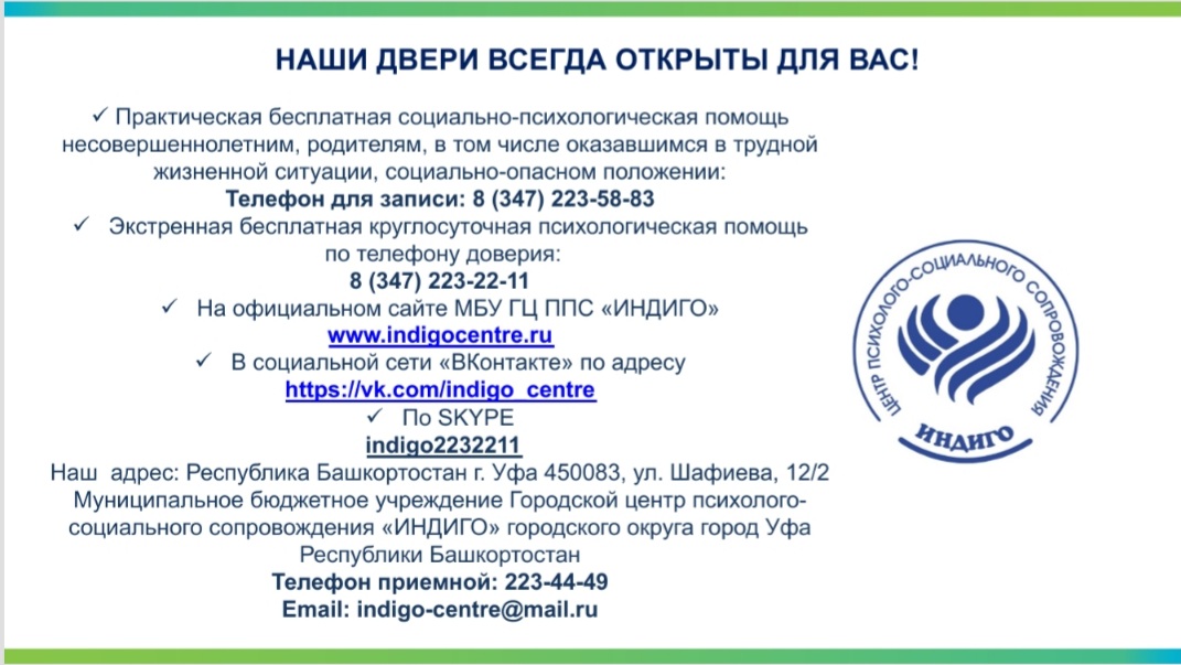 Вниманию студентов были представлены контакты МБУ ГЦ ПСС «Индиго» и номер круглосуточного, анонимного, бесплатного телефона доверия для молодежи.