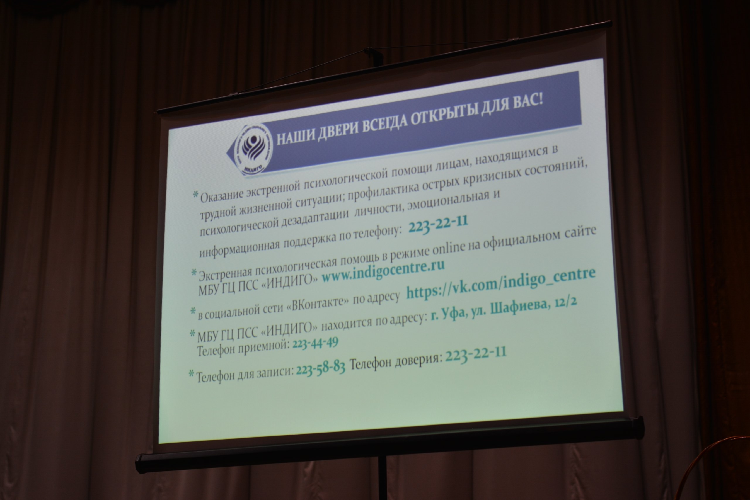 В завершение мероприятия Р.Р. Ямилова представила контакты МБУ ГЦ ПСС «Индиго» и номер круглосуточного, анонимного, бесплатного телефона доверия для молодежи.