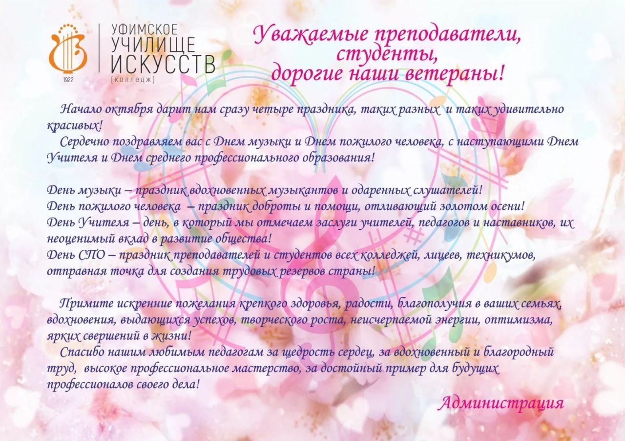 Начало октября дарит нам сразу четыре праздника, таких разных и таких удивительно красивых! Сердечно поздравляем вас с Днем музыки и Днем пожилого человека, с наступающими Днем учителя и Днем среднего профессионального образования!