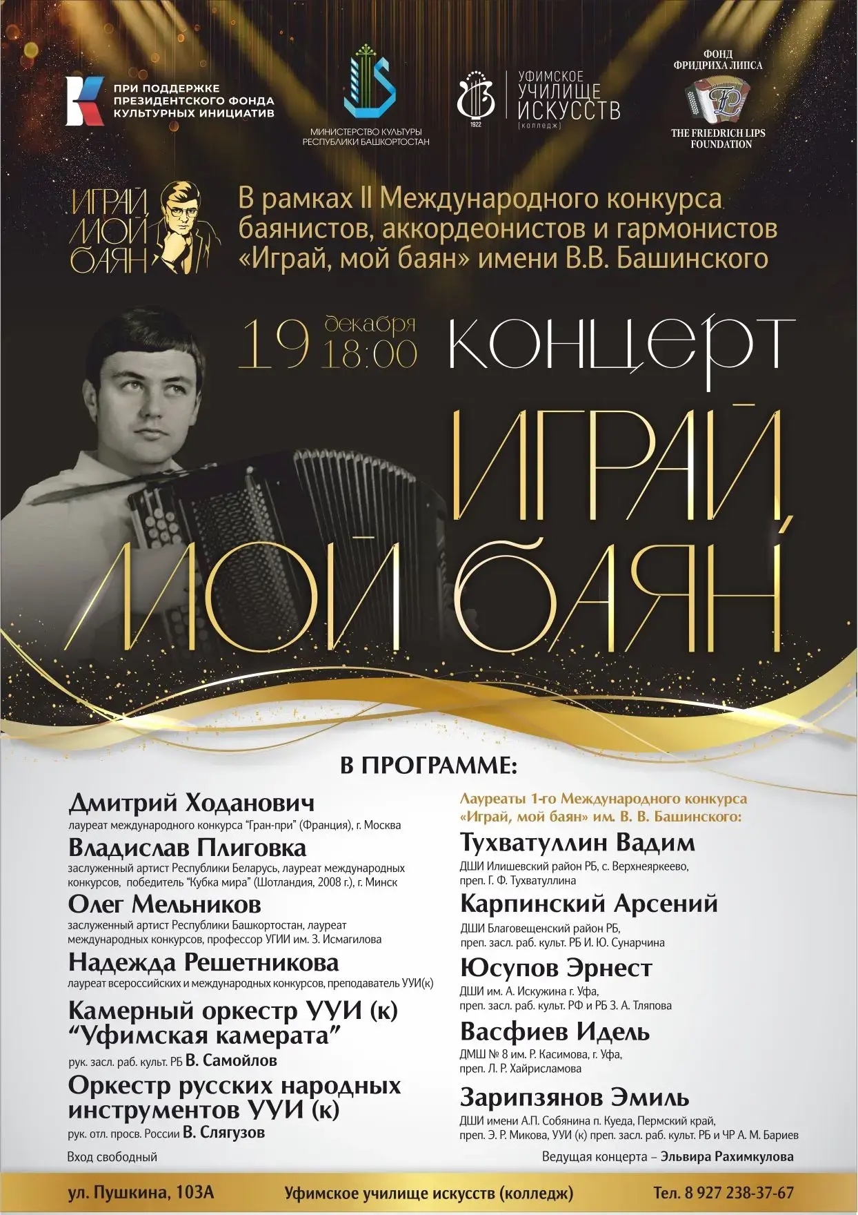 В рамках II Международного конкурса баянистов, аккордеонистов и гармонистов имени В.В. Башинского состоится торжественный концерт-открытие «Играй, мой баян». Конкурс проходит в рамках проекта «Международный форум-фестиваль современного баянного и аккордеонного искусства» при поддержке Президентского фонда культурных инициатив