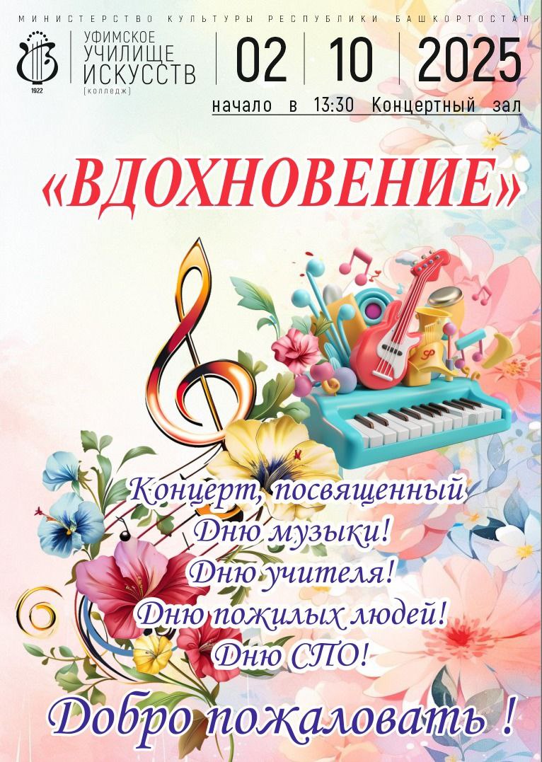 2 октября 2025 года приглашаем в Концертный зал Уфимского училища искусств на концерт, посвящённый Международному Дню музыки, Дню учителя, Дню пожилых людей и Дню среднего профессионального образования. Начало в 13 часов 30 минут. Добро пожаловать!
