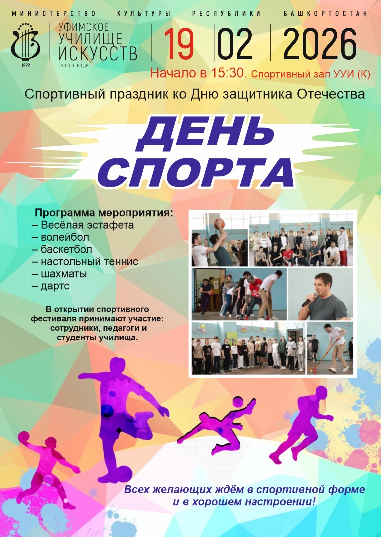 Приглашаем всех желающих на спортивный праздник ко Дню защитника Отечества, который состоится 19 февраля 2026 года в спортивном зале Уфимского училища искусств! Начало в 15.30.