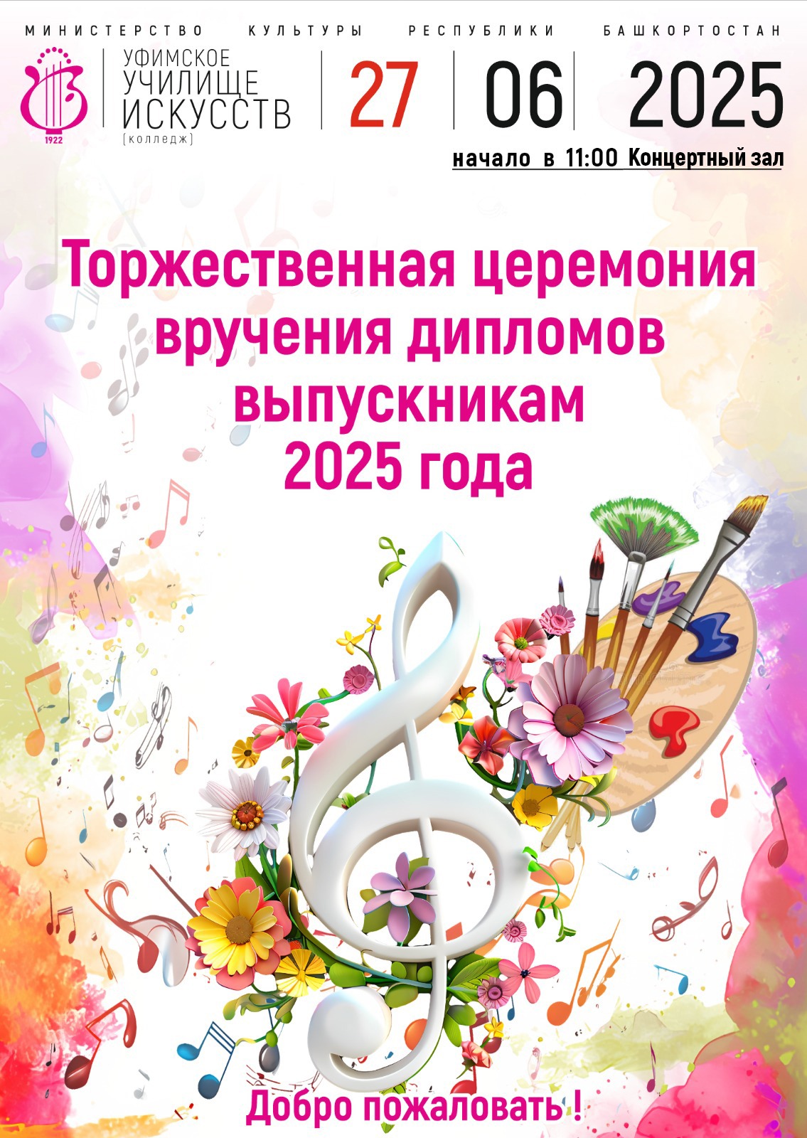 27 июня в Концертном зале состоится торжественная церемония вручения дипломов выпускникам 2025 года. Начало – в 11.00 часов. Добро пожаловать!