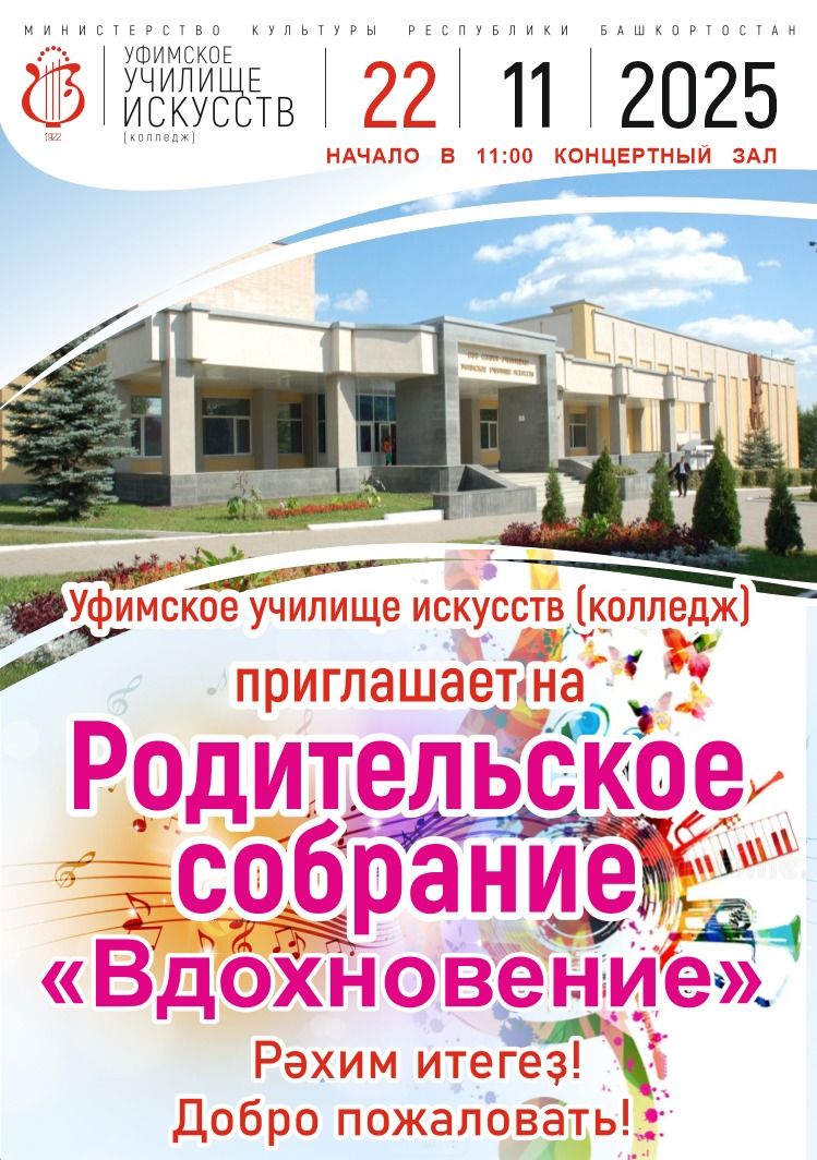 22 ноября 2025 года приглашаем родителей в Концертный зал Уфимского училища искусств на родительское собрание «Вдохновение». Начало в 11.00. Добро пожаловать!