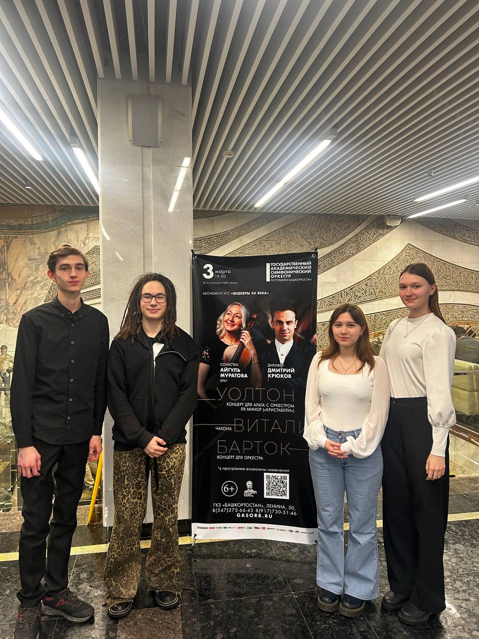 3 марта студенты 1 и 3 курсов предметно-цикловой комиссии «Оркестровые струнные инструменты» вместе с классными руководителями Беллой Фаритовной Зайнаговой (председатель ПЦК «ОСИ») и Айгуль Рустемовной Денисламовой сходили на концерт Государственного академического симфонического оркестра Республики Башкортостан «Шедевры мировой классики. Уолтон, Витали, Римский-Корсаков», состоявшийся в Государственном концертном зале «Башкортостан».