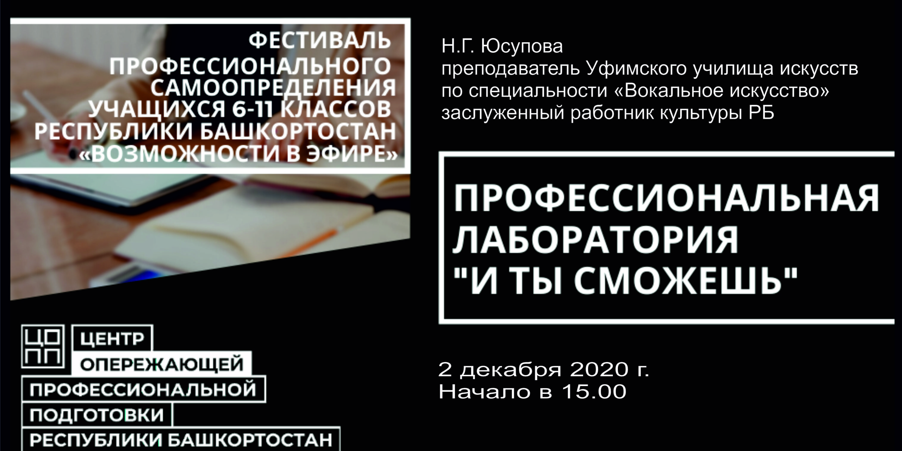 2 декабря 2020 года в рамках фестиваля профессионального самоопределения «Возможности в эфире» Уфимское училище искусств организует мастер-класс по академическому пению. В роли наставника выступит преподаватель специальности «Вокальное искусство», заслуженный работник культуры Найля Габделхаевна Юсупова.