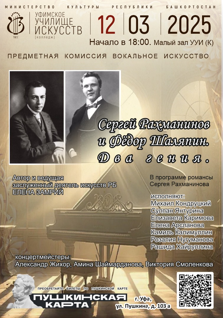 12 марта 2025 года приглашаем в Малый зал Уфимского училища искусств на вечер вокальной музыки, посвященный творчеству двух русских музыкальных гениев — Сергея Рахманинова и Фёдора Шаляпина. Автор проекта и ведущая — заслуженный деятель искусств Республики Башкортостан, председатель Уфимского отделения Шаляпинского центра, научный сотрудник Музея музыки имени Ф.И. Шаляпина Елена Замрий. Начало в 18.00 часов. Добро пожаловать!