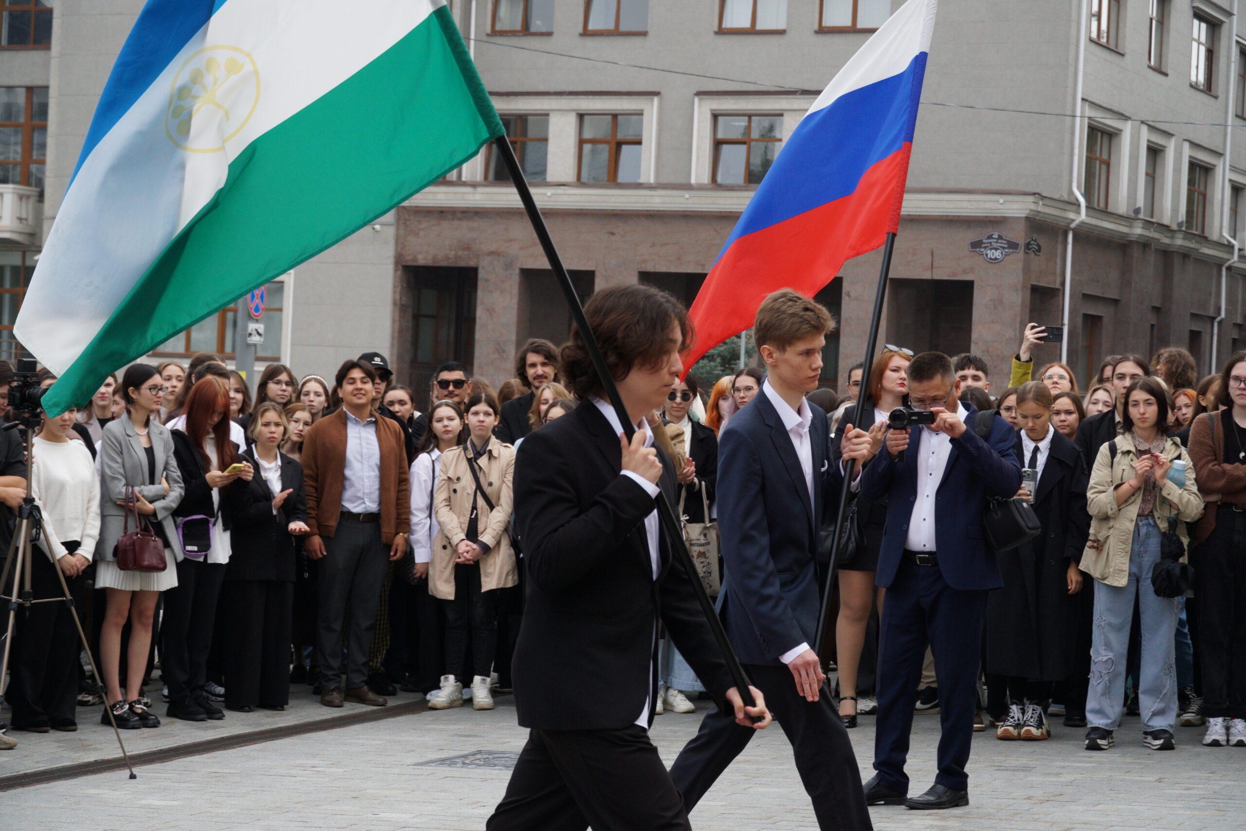 Почетное право выноса знамен Российской Федерации и Республики Башкортостан было предоставлено студентам Уфимского училища искусств Салавату Хакимьянову и Салавату Султанбаеву.