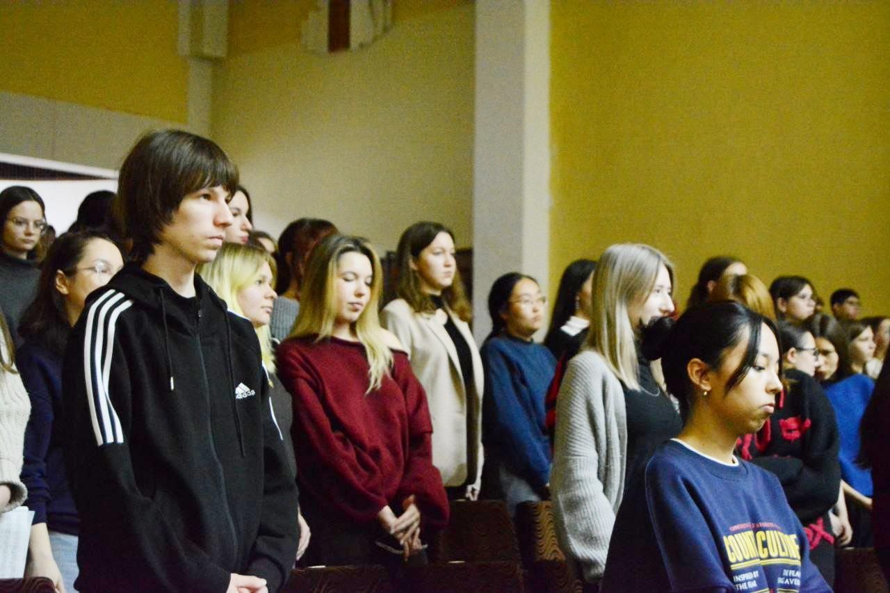 Почетное право выноса знамен было предоставлено студентам 1 и 2 курсов специальности «Инструментальное исполнительство» по виду «Оркестровые струнные инструменты» Самату Гарипову и Константину Ершову.
