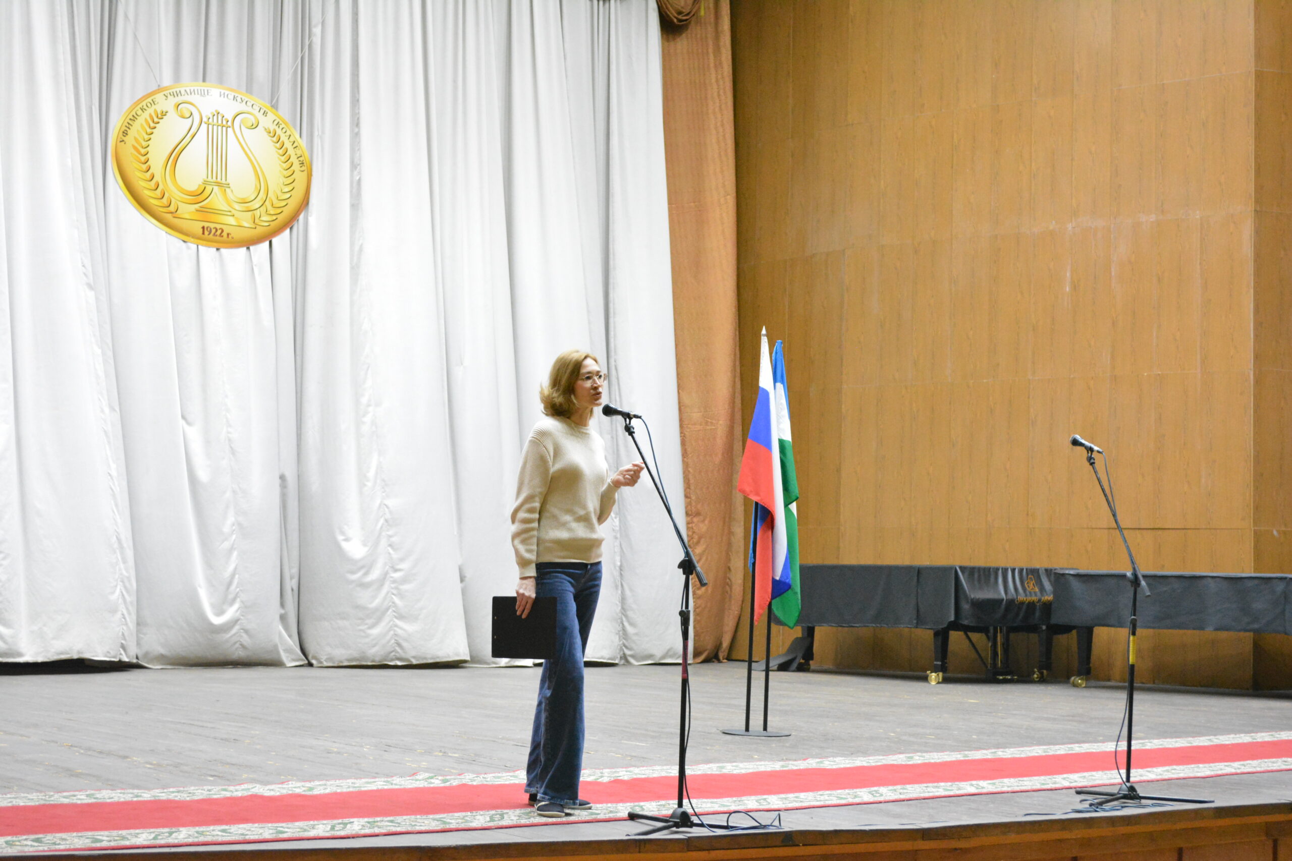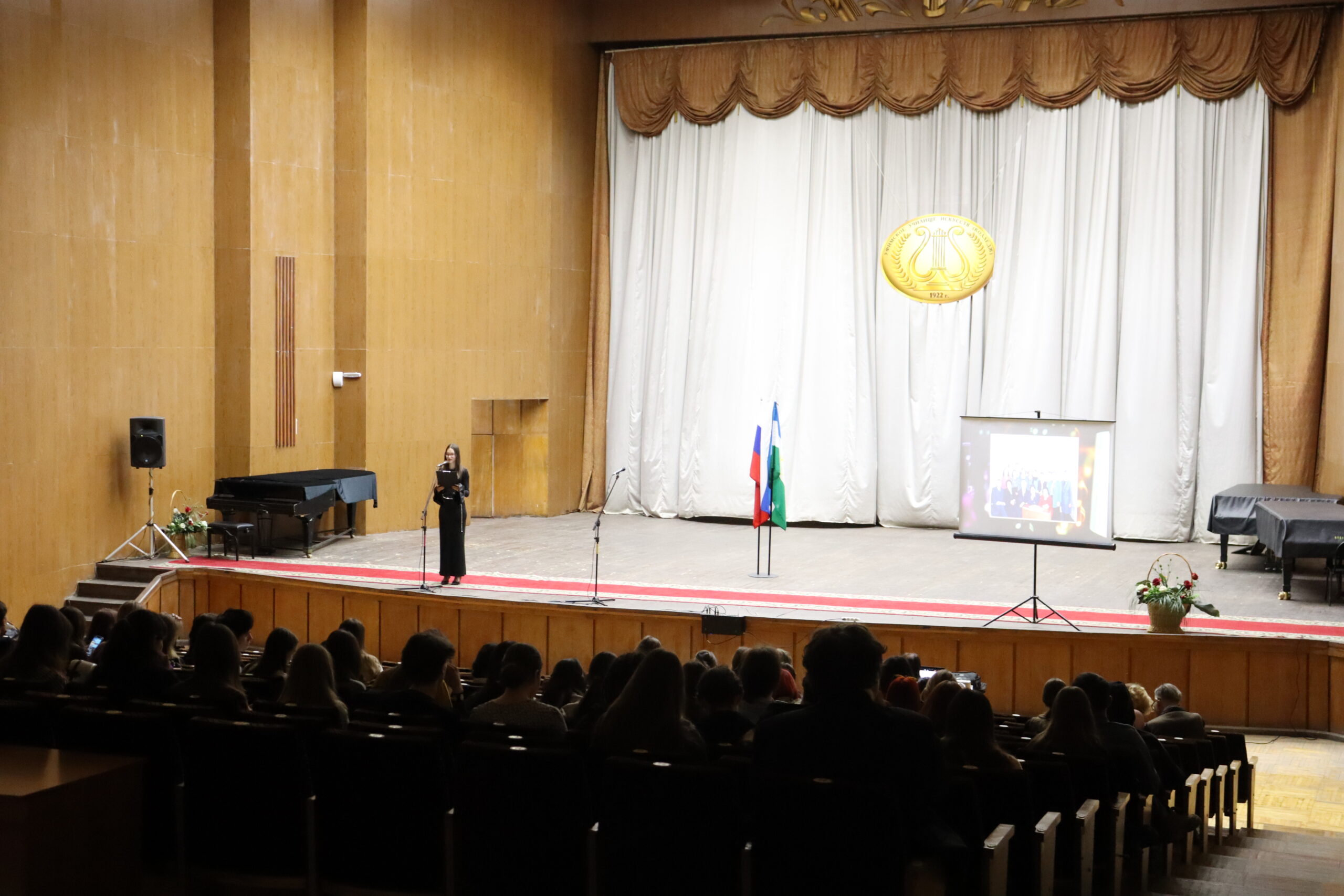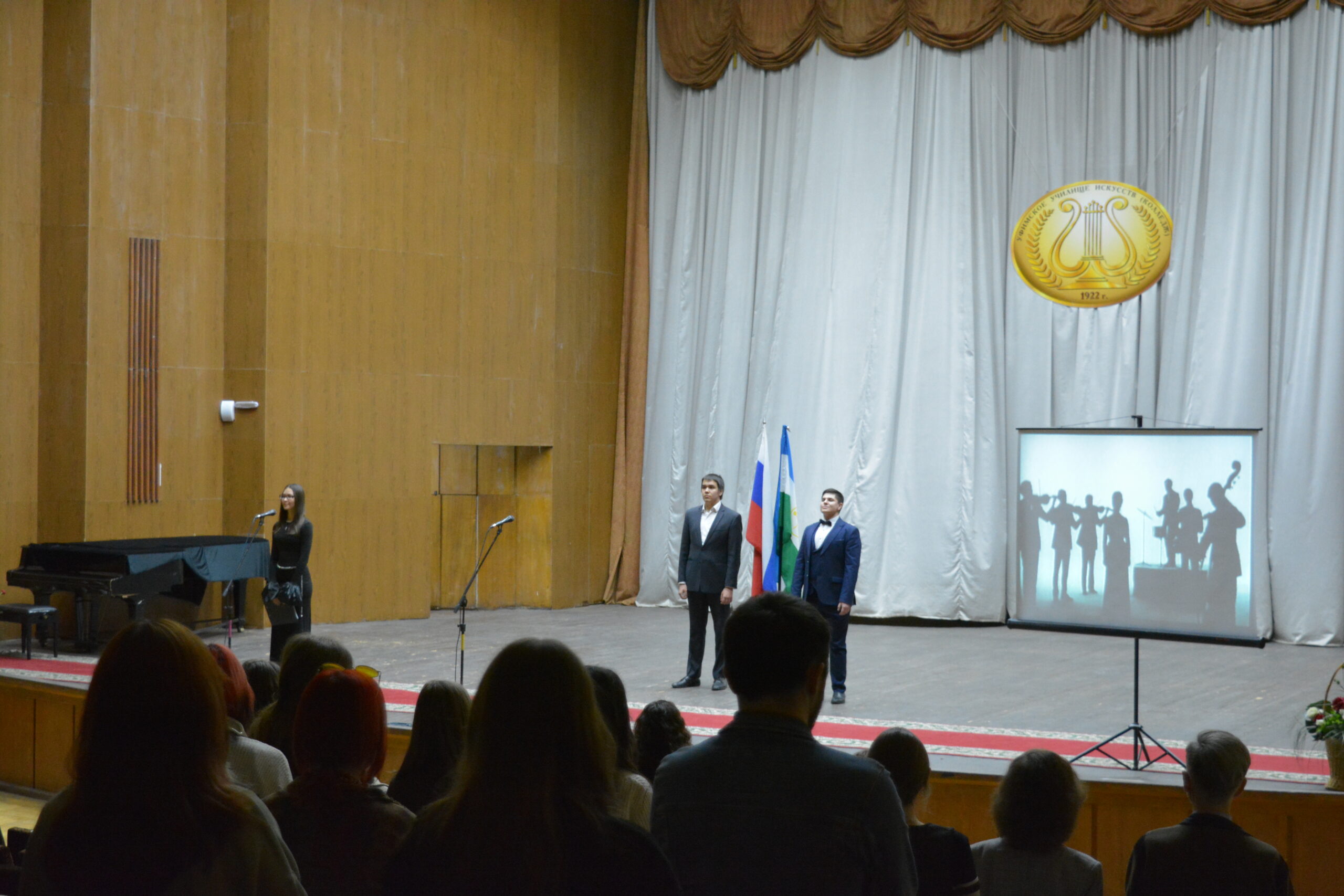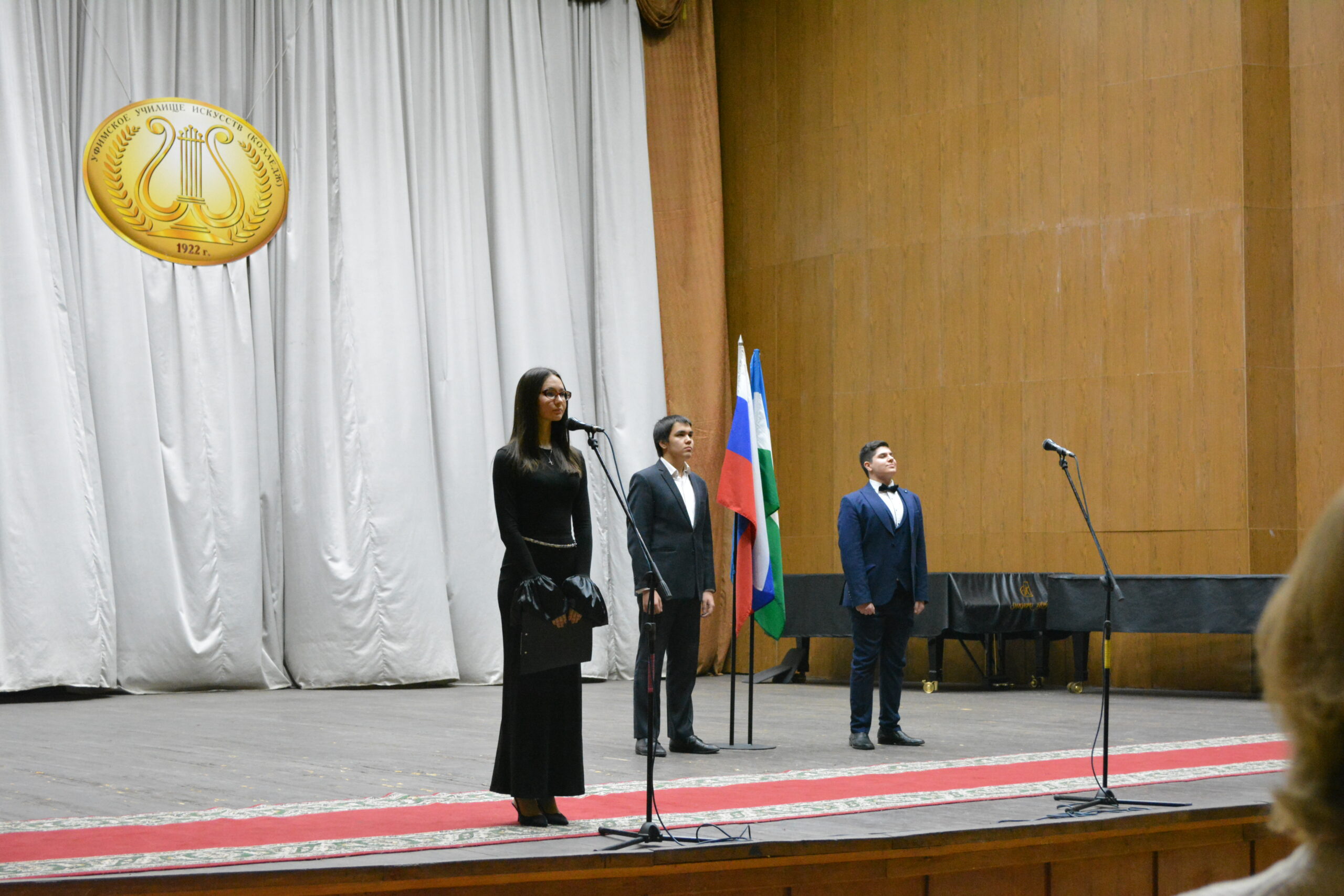 16 февраля 2026 года в Уфимском училище искусств состоялось торжественное мероприятие, которое по традиции началось с церемонии, посвященной флагам и гимнам Российской Федерации и Республики Башкортостан. Почетное право выноса знамен было предоставлено студентам 2 и 3 курсов специальности «Вокальное искусство» Кариму Узбекову и Зульмиру Закирову.