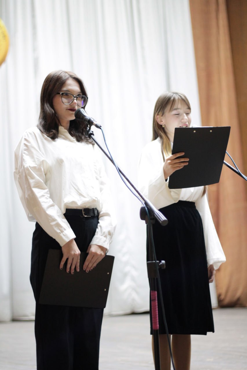 Ведущие мероприятия, студенты 2 курса специальности «Инструментальное исполнительство» по виду «Инструменты народного оркестра» Айзира Асадуллина и Аделина Валиахметова пожелали всем успешной и продуктивной недели.