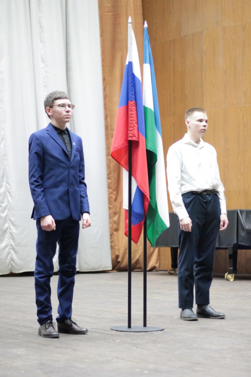 Почетное право выноса знамен было предоставлено студентам 2 курса специальности «Инструментальное исполнительство» по виду «Инструменты народного оркестра» Дмитрию Мухаметдинову и Эмилю Зарипзянову.