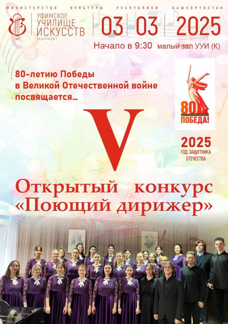 3 марта 2025 года в Уфимском училище искусств (колледж) состоялся V Открытый конкурс «Поющий дирижёр», посвящённый 80-летию Победы в Великой Отечественной войне. Этот конкурс уже пятый год подряд объединяет талантливых студентов специальности «Хоровое дирижирование», а в этом году впервые была представлена новая номинация — «Вокальные ансамбли».